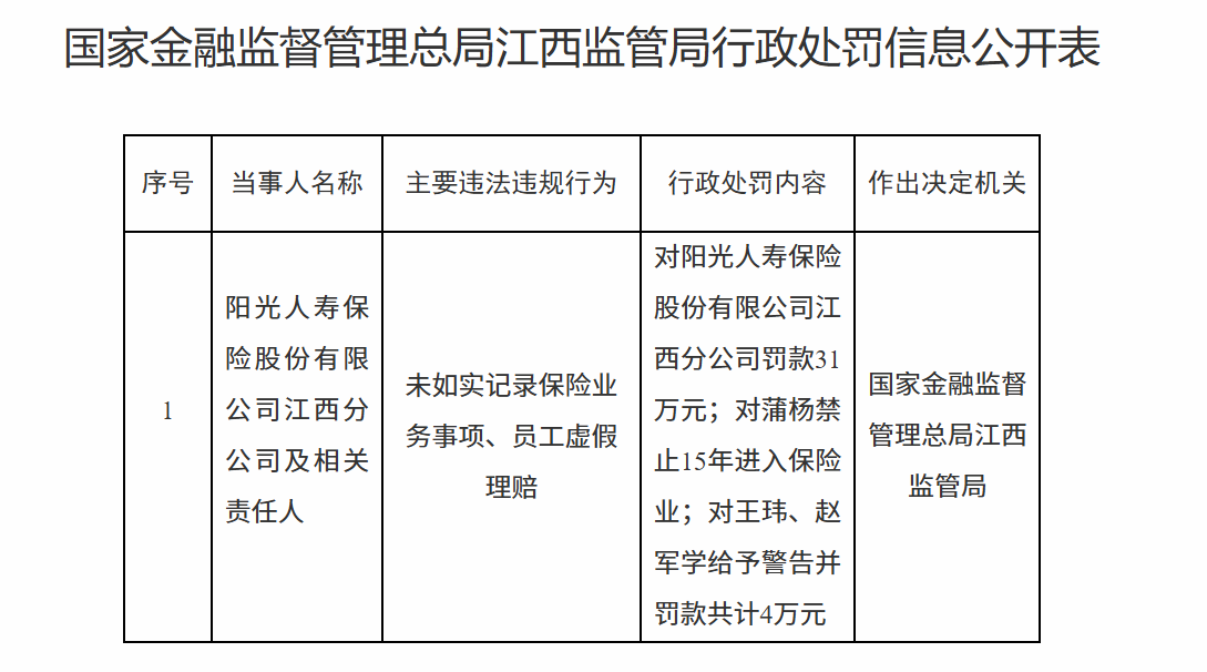 1月30日,国家金融监督管理总局江西监管局行政处罚信息公开表显示,阳光人寿保险股份有限公司江西分公司因未如实记录保险业务事项、员工虚假理赔被罚款31万元;责任人蒲某被禁止15年进入保险业;王某、赵某学被给予警告并罚款共计4万元。