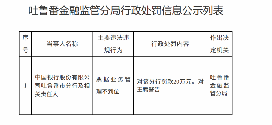 1月30日,吐鲁番金融监管分局行政处罚信息公示列表显示,中国银行股份有限公司吐鲁番市分行因票据业务管理不到位被罚款20万元。责任人王某被警告。
